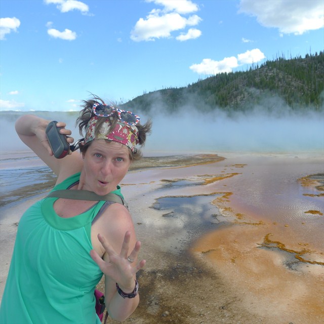“The Grand Prismatic Spring is my favorite place on the planet. The longer I sit there on the boardwalk, the further away my troubles seem. We get so used to seeing streets, houses, power lines, and cars in our daily lives that these things become our Normal. Geocaching offers us caching options in pretty much every environment on the planet, and I’m a big sucker for the strange and glorious spots. I love being reminded that I live on a planet filled with rare and beautiful geologic features. The Grand Prismatic Spring offers a fascinating variant on the deadly beauty of volcanoes: the magma is underground, but we can see its effects on the steaming groundwater in the beautiful pools that dot Yellowstone National Park. Walking right up to something as resplendent as the Grand Prismatic Spring, knowing I’m standing atop a subterranean volcano all the while, gave me such a thrill that all I wanted to do was share it. We civilized folks just don’t get to experience surreal moments very often, and I wanted to let others know there was something worth pulling off the road for, something amazing to experience and think about.
