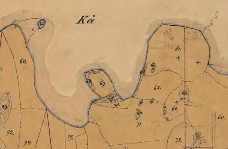 Kartan från år 1870 (14-PAR-107) visar det lilla näs (nummer 67) som gick ut i Kåsjön vid Lyckekärr. Näset och området närmast sjön var en del av utmarkerna till Öjersjö Storegården. Gårdsbyggnaderna låg ett kort stycke söder om näset. Sedan sjön reglerats har näset hamnat under vatten. Vid denna cache får du vandringens snårigaste upplevelse! Det kan dessutom vara blött på platsen, med andra ord; en trevlig cache att logga! Det finns många som promenerar på gångvägen några meter bort så försök att inte dra alltförmycket uppmräksamhet till dig när du letar.