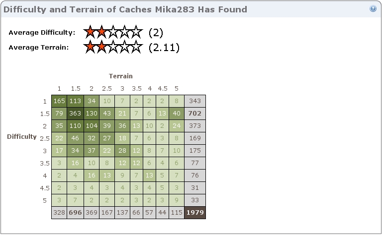 Der Name des Caches ist Programm. Es gibt 81 Schwierigkeit/Gelände-Kombinationen. Du musst jede dieser Kombinationen mindestens zweimal gefunden haben.