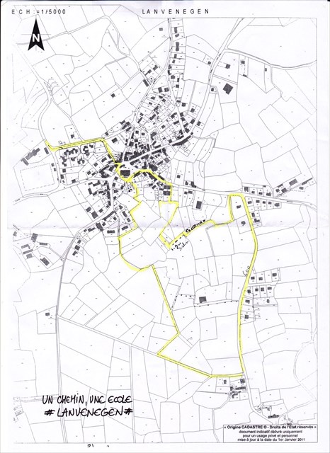 Trois kilomètres de promenade qui part de l’école, emmenant les enfants et les amateurs de randonnée à la rencontre des oiseaux, des plantes, au détour des rues, de la place, une promenade qui se poursuit par des parcelles communales pour rejoindre le chemin de Lanveur, la zone humide derrière la mairie et enfin revenir par le bois de l’école.