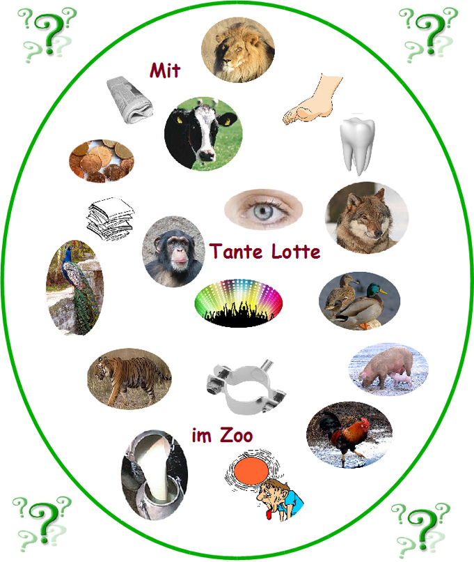Kaum angekommen haben sich die drei Mädchen auf Erkundungstour begeben. Die Schwestern Uschi und Lotte suchen sich erst einmal ein schattiges Plätzchen unter der Kastanie und bestellen einen Becher Kaffee . Sofort beginnen sie mit einem ausgiebigen Schwätzchen . Uschi erzählt, dass sie letzte Woche zu einer Hochzeit eingeladen wurden: „Mein Heinz war ja früher ein richtiger _ _ _ _ _ _ _ _ _ (B) , der keine Feier und keinen Tanz ausgelassen hat, heute ist er wohl mehr ein _ _ _ _ _ _ _ _ _ _ _ (C) , eine einzige Pflichtrunde hat er mit mir am ganzen Abend gedreht.“ Daraufhin sagte Lotte: „ Horst hat sich ja noch nie was aus Feiern gemacht, außer wenn seine Eintracht gewonnen hat. Im Urlaub ist er meistens mit der Botanikerbrille durch Wald und Flur gelaufen, und hat sich gefreut, wenn er _ _ _ _ _ _ _ _ _ _ (D), _ _ _ _ _ _ _ _ _ (E) oder _ _ _ _ _ _ _ _ _ _(F) entdeckt hat.“ Inzwischen sehen die 3 Mädchen mal wieder vorbei: „ Wir haben die Kaninchen mit _ _ _ _ _ _ _ _ _ (G) gefüttert. Beim Pflücken haben wir jede Menge Schmetterlinge gesehen, auch ein _ _ _ _ _ _ _ _ _ _ (H) war dabei .Jetzt haben wir aber Hunger und möchten ein Eis, aber ein riesengroßes! Wir geben auch Geld aus unserem _ _ _ _ _ _ _ _ _ _ _ (I) dazu.“ Nachdem die Mütter dann doch alles bezahlt haben, brechen die fünf „Frauen“ gemeinsam zu einer zweiten Runde durch den Zoo auf.