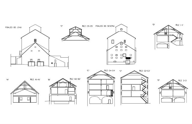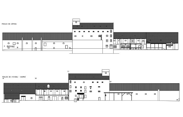 Narys severniho a jizniho pruceli traktu byvaleho pivovaru. Rezy jednotlivymi objekty.