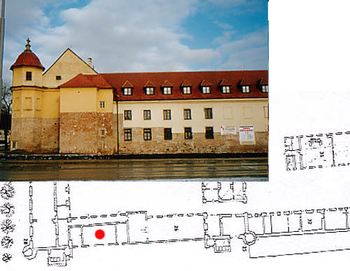 Cerveny puntik ukazuje misto, kde se nachazel puvodni pivovar kartuzianskeho klastera Nejsvetejsi trojice v Brne - Nove Vsi.