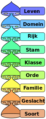 Rijk, stam, klasse, orde, familie, geslacht en soort. Er zijn nog meer tussen rangen, maar de belangrijksten zijn weergegeven. Alle organismen( = levend wezen met eigen stofwisseling, dus planten, dieren, schimmels en bacteriën) worden ingedeeld volgens deze indeling.