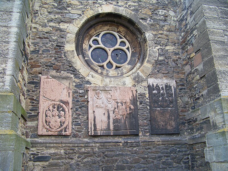 The church of St. Stephen in the main square was built in 1260s by the Cistercian Order. The nearby belfry originates from 1525. On the external walls of the church there is an interesting display of fifteen Renaissance tombstones. They are made of marble and red sandstone and were originally inserted in the church floor. There is a big rose window with circle-shaped tracery in the wall of the north tower. You can see three tombstones below this window. The middle one (almost square) has several human figures on it. How many? The number = a. (a temporary spoiler: if this side of the church is under repair and unaccessible, you can see it at least on a photo attached to this listing; "a" is an odd number amidst zero and ten :-))