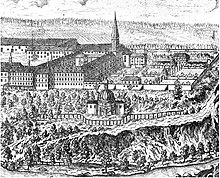Kloster Weihenstephan mit der Kapelle St. Korbinian am Südhang. Kupferstich von JA Zimmermann, 1767, Ausschnitt