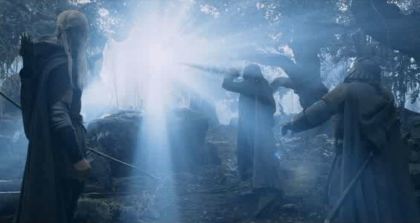 Hier werden Aragorn, Legolas und Gimli von einem hellen Licht geblendet.
