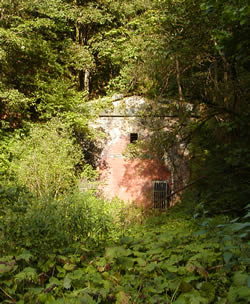 das zugewachsene Tunnelportal, zum Schutz der Fledermäuse zugemauert und verschlossen
