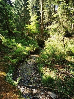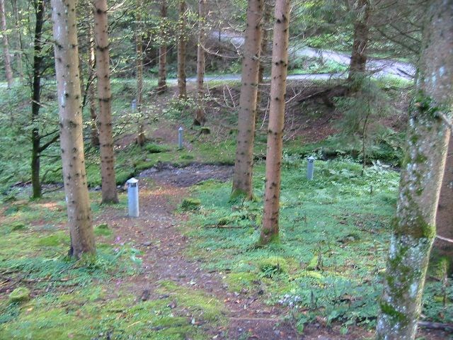 Relikte eines vermeintlichen versunkenen Hexendorfes – wie Schornsteine, die aus dem Waldboden ragen, eine Wetterfahne, Tore aus großen Ofengabeln und ein von aufgeklappten Zauberbüchern umstellter riesiger Hexenkessel – und auf der anderen Talsenke der „Hexen-Verhörplatz“ – geben einerseits Zeugnis vom Mythos Hexe, wie andererseits