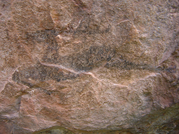 Pero vayamos a la razon de la inclusion del paraje en la serie tematica de yacimientos de pinturas rupestres. En la mitad del abrigo, podemos (o podiamos) ver un impresionante ciervo a la carrera. Actualmente esta bastante mal conservado, debido, como no, a la falta de escrupulos por parte de los visitantes que, segun me informaron en el centro de visitantes de Santa Elena, tienen por norma echar vino a la figura por que piensan que asi se ve mejor. Esta estupida costumbre, junto con los toqueteos y algun otro episodio (recientemente a un inteligentisimo personaje se le ocurrio barnizarla para que resaltara mas, con consecuencias nefastas) han echo que a dia de hoy, si bien aun puede distinguirse la forma, diste mucho de la claridad con que podia observarse hasta hace poco.