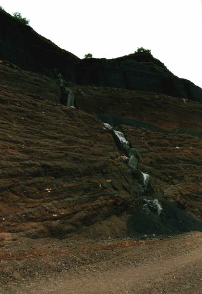 Die erste Ausbruchsphase lässt sich erkennen an den steil in den Berg einfallenden, dunkel geschichteten Schlacken, die über Kieseloolith-Schottern, verkieselten Sanden, tertiärem Ton und devonischem Schiefer liegen. Es folgte eine längere Ruhepause in der sich Löss und anschließend Wehrer Bims über die vulkanischen Auswurmassen legte. Danach muss eine intensive Bodenbildung stattgefunden haben. Es konnte festgestellt werden, dass die Bodenbildung in keiner Kaltzeit erfolgte und das hier zeitweise ein Kratensee verhanden war. Die Schichtenfolge in der fossilen Kratenmulde dokumentiert eine Kaltzeit und im Anschluss eine Warmzeit. Über den Humusablagerungen der Kratermulde liegen Löss und Basalttuffe von unbekannter Herkunft, die in einer zweiten Kaltzeit abgelagert wurden.