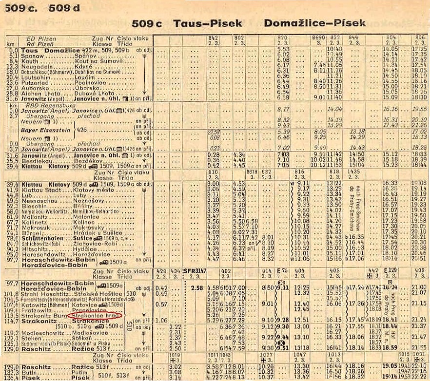 Ukázka jízdního řádu (protektorátního) se zastávkou Strakonice hrad.