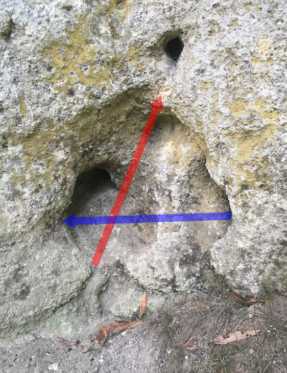 - zahľaďte sa smerom na zámok, a pozorujte travertín tesne nad dnom priekopy, pri ohradenom vstupe k jazierku. Odhadnite výšku nezarastenej časti a uveďte orientáciu vrstiev