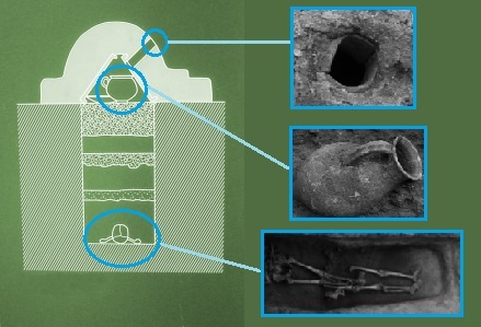As general, inside the cupae structiles there was an interior chamber for the offerings, where a ceramic piece was usually placed (see image below). This was where the libation conduit was going to stop. Describing the libation, it was based on the idea that funerary banquets and delivery of offerings were held to keep alive the memory of the deceased and ensure his immortality. These offerings were introduced through an open conduit in the tomb that kept the deceased in communication with the outside. The libations liquids used was wine, milk and blood, three liquids that symbolized life. These ceremonies and banquets were held on certain days throughout the year and on special occasions.