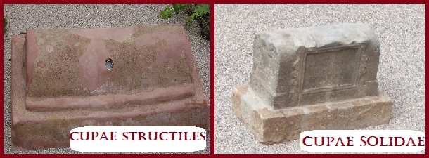 Les cupae, (“cupa”, terme llatí que significa “bota”o “tonel”) la forma de la qual recorda una bota (tonel d’aigua) de fusta reproduïda en pedra. Les cendres del difunt o el seu cos podien estar situats dins les pedres, i en altres casos enterrades sota les cupae. En principi s'ha vinculat la cupae solidae al ritu d'incineració, mentre que la cupae structilis ho estaria amb el d'inhumació. A part d'aquesta dada, els cupae es poden distingir en funció de les característiques tècniques emprades en la seva construcció: