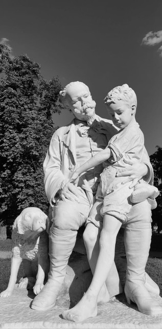 Il re seduto su una roccia trova il tempo per ascoltare le difficoltà e la storia di vita di un ragazzo scalzo di paese. Appare sereno, con lo sguardo bonario e l’affetto paterno tipico di un momento di vita familiare. Il fanciullo, dal canto suo, regge dietro la schiena il suo cappello, in un atteggiamento spontaneo e disinvolto, a confermare il realismo di una scena quasi bucolica e di grande effetto. Lo scultore, discendente da una nobile famiglia d’origine spagnola, fu figlio d’arte (suo padre, Antonio, è stato un abile calligrafo e noto miniaturista). Ettore Ximenes (Palermo, 1855 – Roma, 1926) si formò all’Accademia delle Belle Arti di Palermo. Poi si trasferì a Napoli, dove ebbe come maestro, tra gli altri, Vincenzo Gemito. Fu scultore, ma anche illustratore di opere di Edmondo De Amicis e di Policaro Petrocchi, e valente pittore. Le sue sculture sono prevalentemente personaggi storici, religiosi e mitologici e sono caratterizzate da uno spiccato e stupefacente realismo. Sono disseminate in molte regioni italiane (Aquileia, Sarno, Enna, Parma, Roma, Milano, e Pesaro). In Piemonte, oltre alla citata scultura del Parco torinese della Tesoriera, si conserva a Peveragno un suo monumento dedicato all’eroe dell’Amba Alagi, Pietro Toselli,