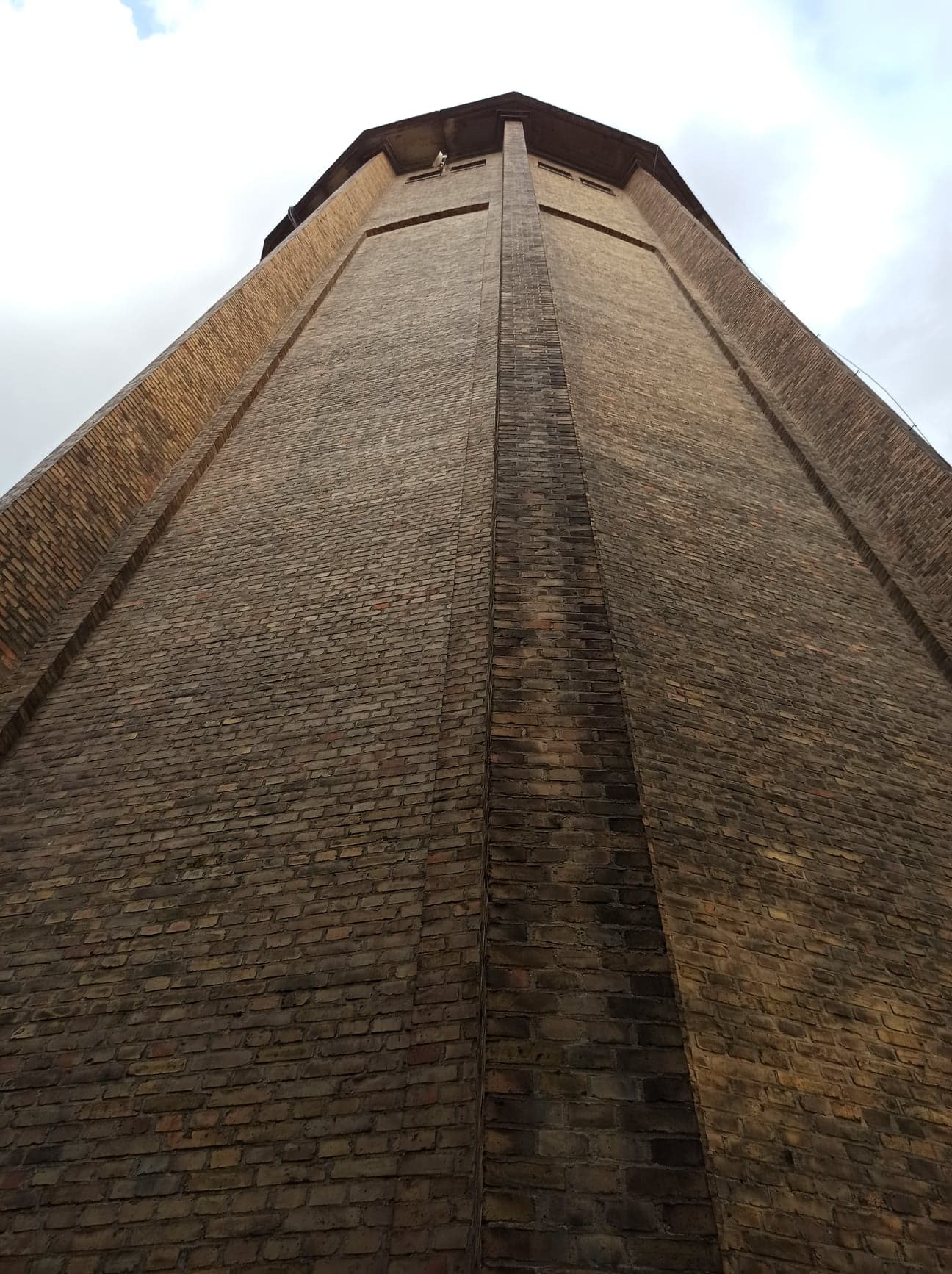 Zachodnia wieża ciśnień sięga 35m wysokości, szeroka jest natomiast na 15,7m, posiada sześć pięter, jest podpiwniczona, daje to ogółem osiem kondygnacji. Cała konstrukcja oparta jest na rzucie dwunastokąta foremnego o boku 3,8m. Z bardzo niskiej piwnicy, poprzez łukowy otwór w ścianie zewnętrznej, wyprowadzono stalowe rury doprowadzające i odprowadzające wodę. Obecnie piwnica jest zalana, na posadzce stoi około 20-30 cm wody. Na parterze znajduje się kotłownia, węzeł sanitarny, pomieszczenie gospodarcze oraz zawory główne i manometry. Na parterze wieży wylano twardą betonową posadzkę, którą w celu uniknięcia spękań, podzielono na mniejsze części szczelinami dylatacyjnymi. Powierzchnia użytkowa pierwszego piętra podzielona została za pomocą drewnianych ścian działowych na trzy pomieszczenia. Największe z nich przeznaczone zostało na cele socjalno - biurowe, natomiast dwa mniejsze pomieszczenia służyły za magazyny. Powierzchnia drugiego piętra podzielona jest za pomocą drewnianych ścian działowych na dwa średniej wielkości pomieszczenia magazynowe. Piętro trzecie to jeden duży magazyn oddzielony od korytarza drewnianą ścianką działową. Piętro czwarte znajduje się bezpośrednio pod głównym zbiornikiem wodnym. Nie jest podzielone na mniejsze pomieszczenia. W południowo wschodniej części kondygnacji zbiegają się rury zasilająco - powrotne. Piętro piąte to korytarz, biegnący dookoła żelbetowego zbiornika wodnego. Pierwotnie korytarz miał być widny, podczas wznoszenia wieży jednak otwory okienne zostały zamurowane i dziś cała kondygnacja jest ciemna. Szóste i ostatnie piętro to galeria obiegająca wokół szczyt zbiornika wodnego. Kondygnacja na każdej z dwunastu ścian ma otwory okienne, podłoga jest drewniana.