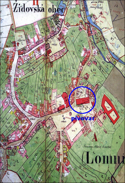 Indikacní skica Lomnice z roku 1874 se zakreslenou polohou pivovaru.