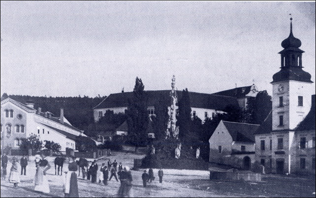 Na historicke fotografii lomnickeho namesti ze zaveru 18. stoleti je vlevo dobre patrna neorenesancni fasada panskeho pivovaru.