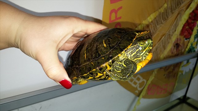 Pan veterinář odhadl její věk na 18 let a poté, co si ji pečlivě prohlédl, podle mohutného a dlouhého ocasu shledal, že se jedná pravděpodobně o želvího samečka, který již pravděpodobně nějakou dobu obývá tůňku Satalické obory. Také jsme se ale dozvěděli, že v naší přírodě je tato želva škůdcem, jenž má za potravu ohrožené druhy čolků, mloků a jiných u nás chráněných živočichů a proto je prý pro naši přírodu lepší želvu z ní odstranit a chovat ji znovu v zajetí.
