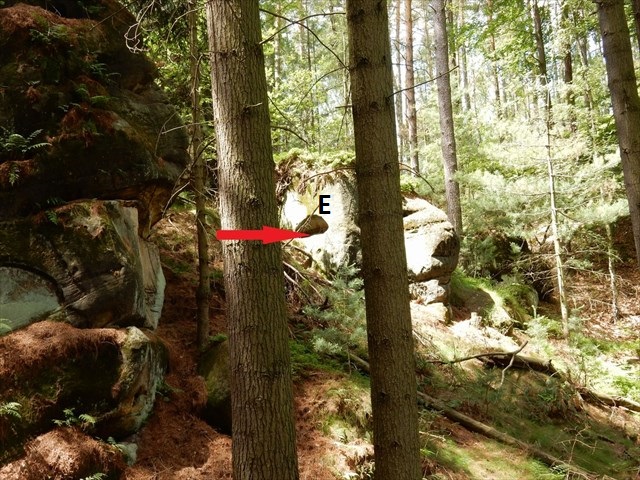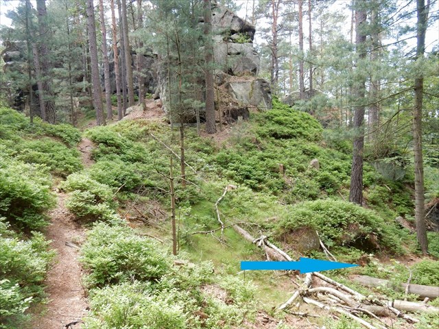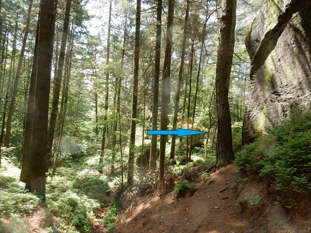 Od skalní brány se vraťte zpět na modrou, na křižovatce doleva na červenou. Cestu po červené turistické značce nechte na souřadnicích N 50°37.877 E 15°10.557 uhnout doleva (cesta 1). Vy pokračujte cestou do údolí. Po 50 metrech se držte vpravo na vrstevnici cestičkou kolem skály (cesta 2)