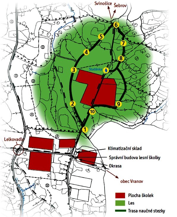 Na trase dlouhé necelé 2 kilometry je instalováno celkem 10 informačních tabulí, na kterých lesníci představují činnosti, které jsou každodenní součástí jejich práce. Na této naučné stezce se návštěvníci lesa dozvědí více o práci v lesních školkách, výchově mladých porostů, budování lesních cest, hubení lesních škůdců a prvotní zpracování dřeva. Mravenec Lesík, hravou a vtipnou formou provází i malé čtenáře a vysvětluje jim mnohé zajímavosti z prostředí Brněnských lesů. Každé stanoviště hlídá dřevěná socha zvířete, která byla vyřezána z jednoho kusu kmene motorovou pilou od umělce z Jeseníků – pana Pecháčka.