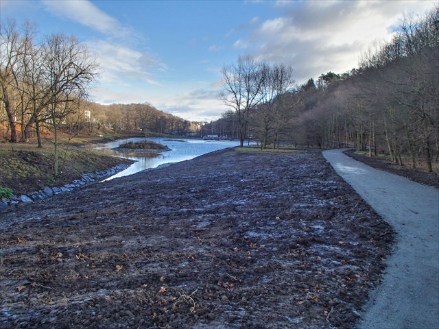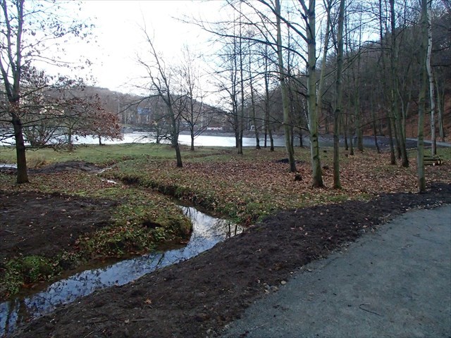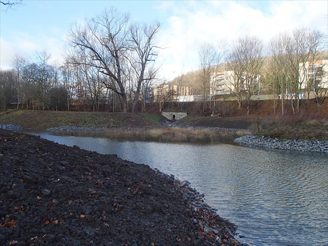 Budu rád, když k logu přiložíte fotografie postupné výstavby nového rybníka. Do listingu vloženy další fotografie. Stav po napuštění, prosinec 2017.