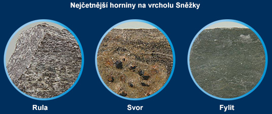Vrchol nejvyšší hory České republiky je tvořen původně muskovit-chloritickými svory, které však byly postiženy kontakní metamorfózou při intruzi granitoidů krkonošsko-jizerského masivu. Díky přenosu tepla během kontaktní metamorfózy došlo k rekrystalizaci těchto hornin a tak i k jejich výraznému zvýšení odolnosti proti zvětrávání. První magmatické horniny - slabě porfyrické biotitické granity lze spatřit na úpatí vrcholu Sněžky při sestupu směrem na Z po cestě na Luční boudu