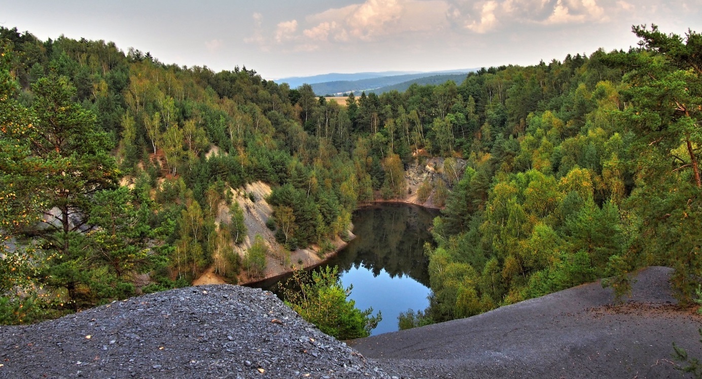 V 16. - 18. století se z břidlice vyráběl kamenec. Zdejší kyzové břidlice proterozoického stáří obsahují příměs, která dává hornině její černošedou barvu. Mimo tyto příměsi a minerály obsahuje značné množství jemně rozptýlené železité horniny. Proto se toto ložisko, které vzniklo 60 m pod úrovní okolního terénu, využívalo k výrobě kyseliny sírové. Roku 1802 získal zdejší doly a chemické závody J. D. Starck a zavedl zde výrobu dýmavé kyseliny, lidově nazývané vitriol. Břidlice se těžila štolami, ale pro její narůstající spotřebu bylo ložisko v roce 1828 otevřeno odklizem. Po odstřelu byla surovina na dně odklizu ručně drcena a odvážena na místo s nepropustným podložím, kde se vršila do hald až 17 m vysokých.Jednotlivé haldy byly v různých směrech proloženy průduchy, jimiž cirkuloval vzduch a dřevěnými korýtky byla přiváděna voda, čímž se zrychlovalo zvětrávání horniny a tímto způsobem se z břidlice získával vitriolový louh, který měl tmavě hnědou barvu. Následně se louh sváděl do dřevěné nádrže zvané štok pomocí dřevěných žlabů. Odtud putoval do krytých, zděných odpařovacích pánví, kde se nadále zahušťoval. Z těchto pánví se louh dále vedl do čistících pánví, kde díky usazování došlo k jeho vyčištění. Čirý louh se vypouštěl do železných varných kotlů, v nichž se zahušťoval do kašovité hmoty, která se vypouštěla na dno varny, kde tuhla v zelenožlutý vitriolový kámen. Pro zbavení přebytečné vody byl kámen pálen v kalcinových pecích. Vitriolový kámen rozemletý na moučku se v kameninových nádobách vkládal do galejních pecí, kde se zahříval, čímž se z něj začala uvolňovat pára v podobě oxidu sírového, která se jímala v nádobách s vodou, čímž vznikala kyselina sírová. Zdejší voda je díky nízkému Ph téměř bez života, přežívají zde pouze drobné řasy. Dle starousedlíků zde po 2. sv. válce stačilo opláchnout boty, aby se vám cestou do vsi odlouply podrážky.
