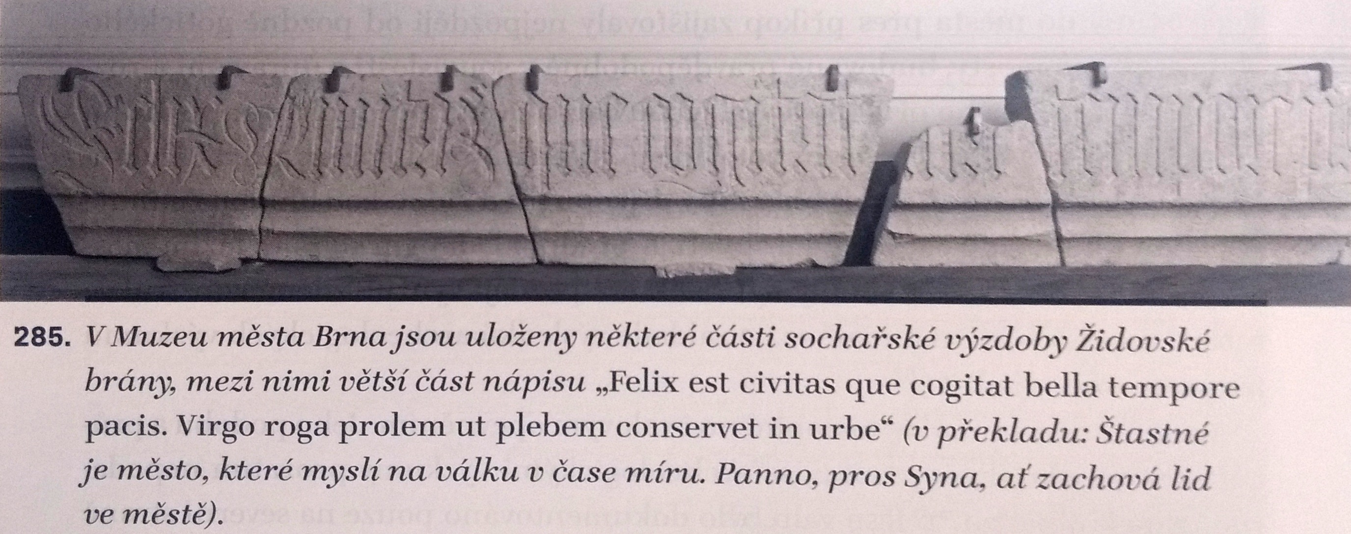 římsy hradební zdi pod Petrovem zazdili při rekonstrukci (1998-2001) stavebníci latinský nápis vyrytý do kamene. Pravděpodobně pochází z Židovské brány a už potřetí při tomto putování jde o úryvek textu "Šťastná je obec, která myslí na válku v čase míru." Zda jde o originál, nebo nějakou (novodobou?) kopii není jasné a shodnout se nemohou historici, ani památkáři. Pro nás je to ale každopádně zajímavá připomínka historie.