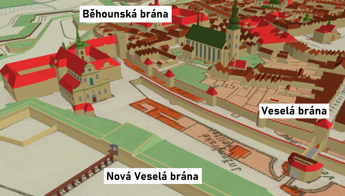 Nejblíže místa, kde právě stojíte, stála v dobách barokního opevnění města Nová Veselá Brána. Dnes jí už nic nepřipomíná (a logicky ji nenajdete ani na modelu). Nacházela se přibližně v místě dnešní zastávky Česká, odkud odjíždějí tramvaje ve směru na Královo Pole, Starou osadu, Štefánikovu čtvrť nebo Obřany.
