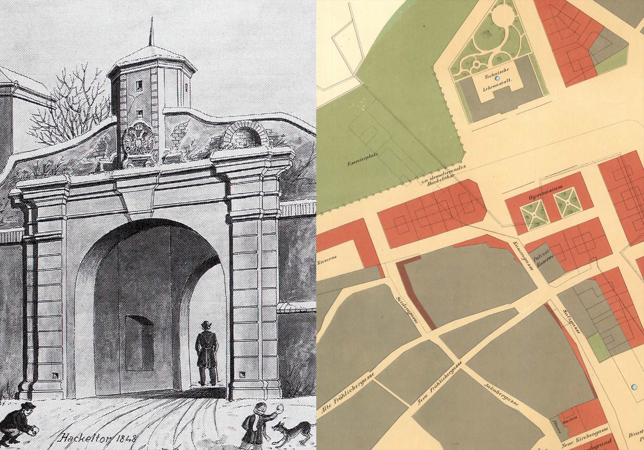 Hackelova brána, Leopold Masur, 1848, Wikimedia / Výřez mapy Brna z roku 1860, kde je vidět umístění Hackelovy brány
