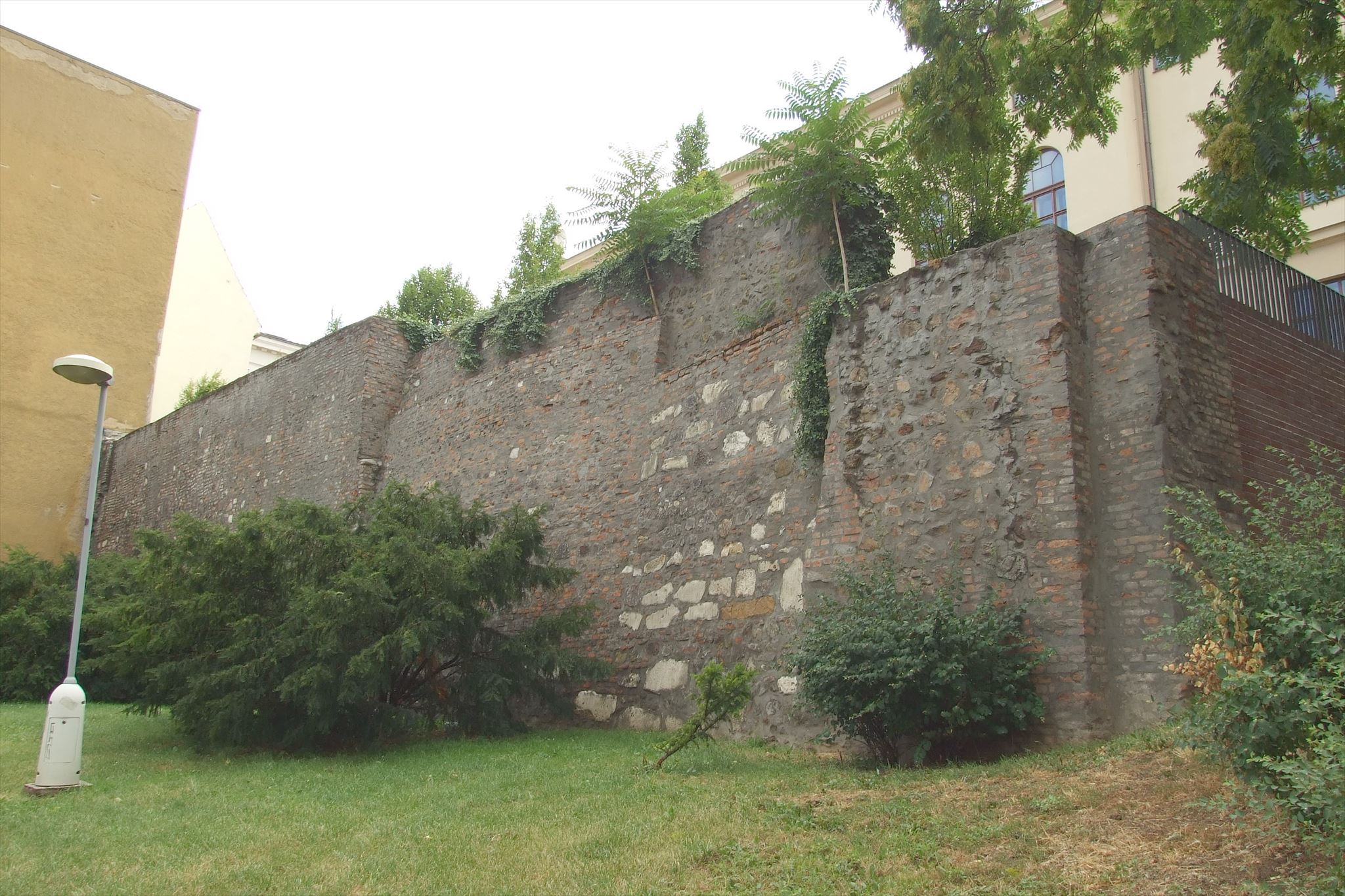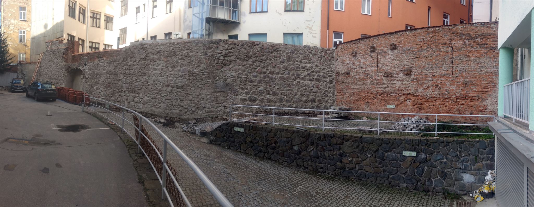 dochované hradby u ulice Jezuitská (ve vnitrobloku domu č. 13). Jedná se asi o 29 metrů dlouhý úsek o šířce jednoho metru a někdy ho lze z ulice zahlédnout díky otevřeným vratům. Novostavba tohoto domu vznikla v 50. letech 20. století na místě náletem zničených domů. Prostor byl od středověku součástí zástavby východní části Široké ulice. Domy svými dvorními částmi přiléhaly k vnitřní stěně městské hradby.