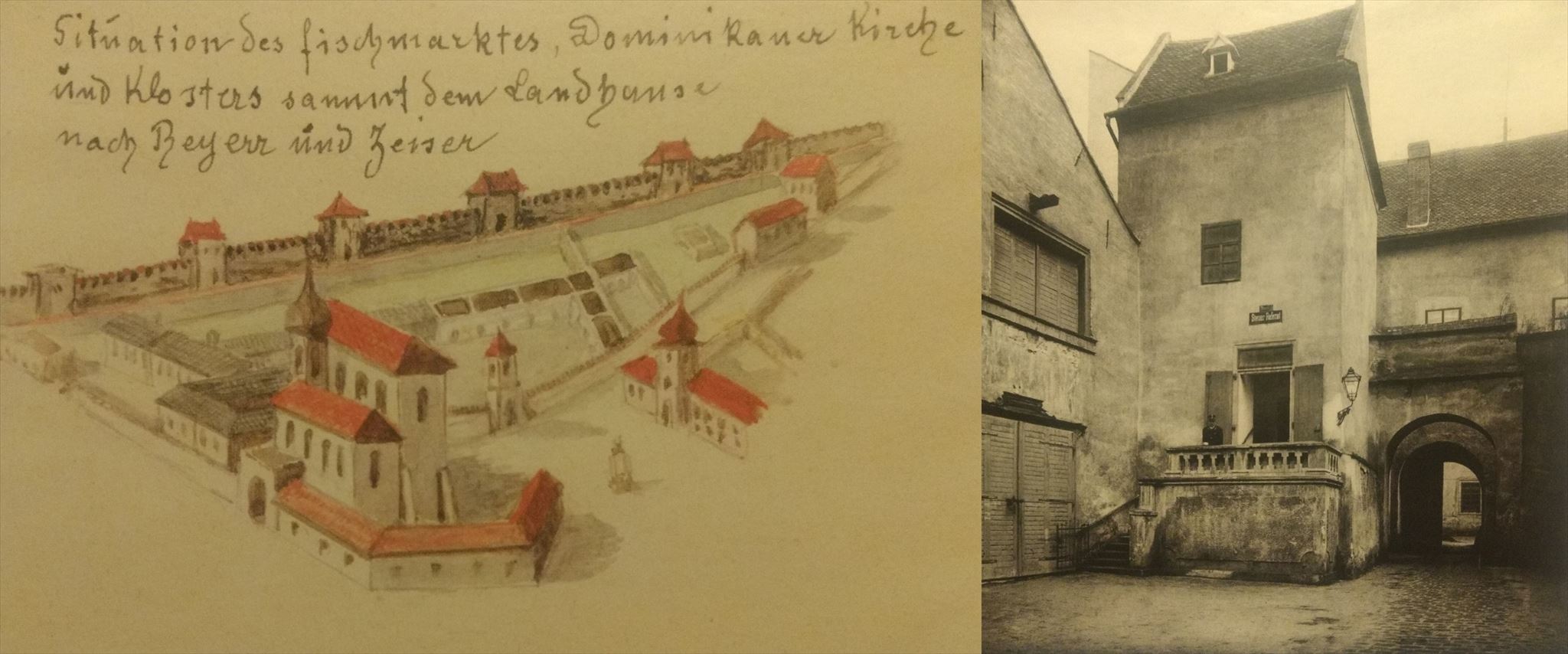 Brněnský klášter dominikánů vznikal už před polovinou 13. století a ve 14. století už stál podél velké části Dominikánské a na západní straně přiléhal k městským hradbám (dnes podél Husovy ulice). Na jeho podobě se podílely požáry, nestabilní sprašové podloží, dělostřelba v roce 1645, následné výstavby, rušení, změny a nakonec v letech 1934–1935 přestavba na Novou radnici. Naopak hradební zeď postupně mizela, až z ní v tomto místě zbyla pouze hranolová věž. Všimnout si jí můžete při průchodu Novou radnicí mezi Dominikánským náměstím a Husovou.