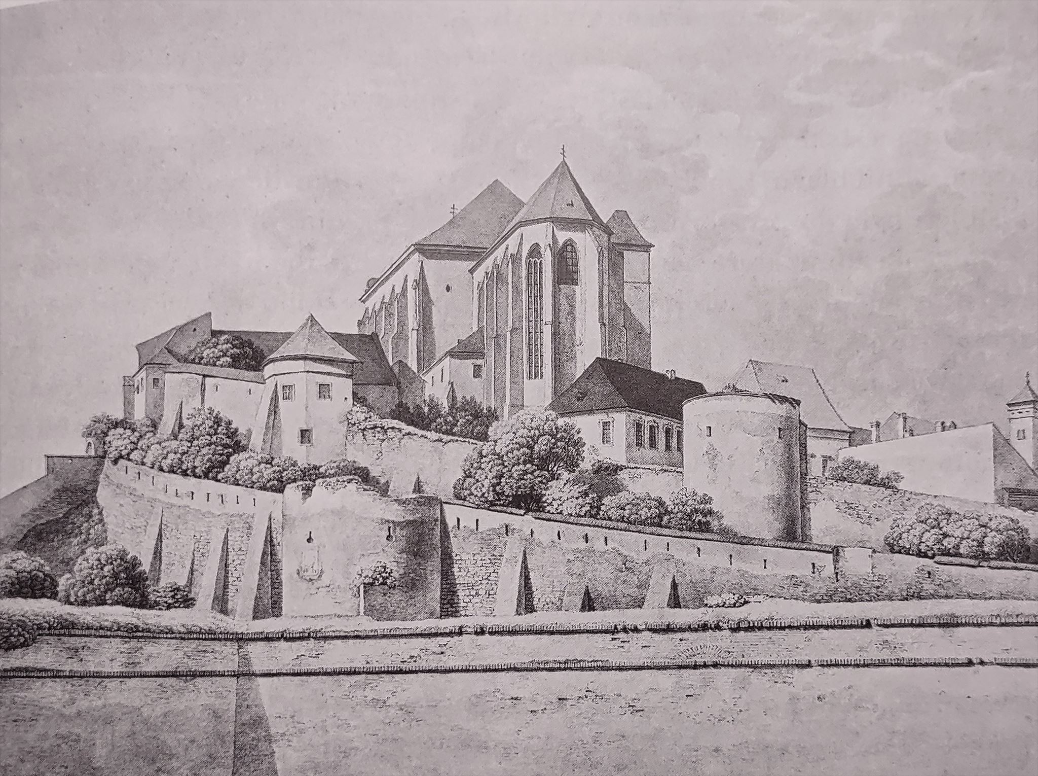 Městské hradby pod Petrovem s věžemi a baštou, Franz Rektorzik, 1817