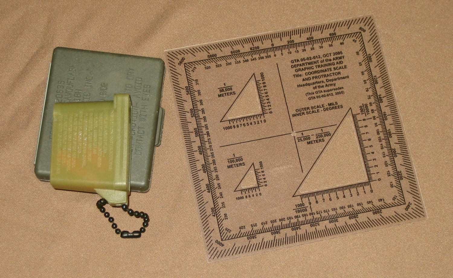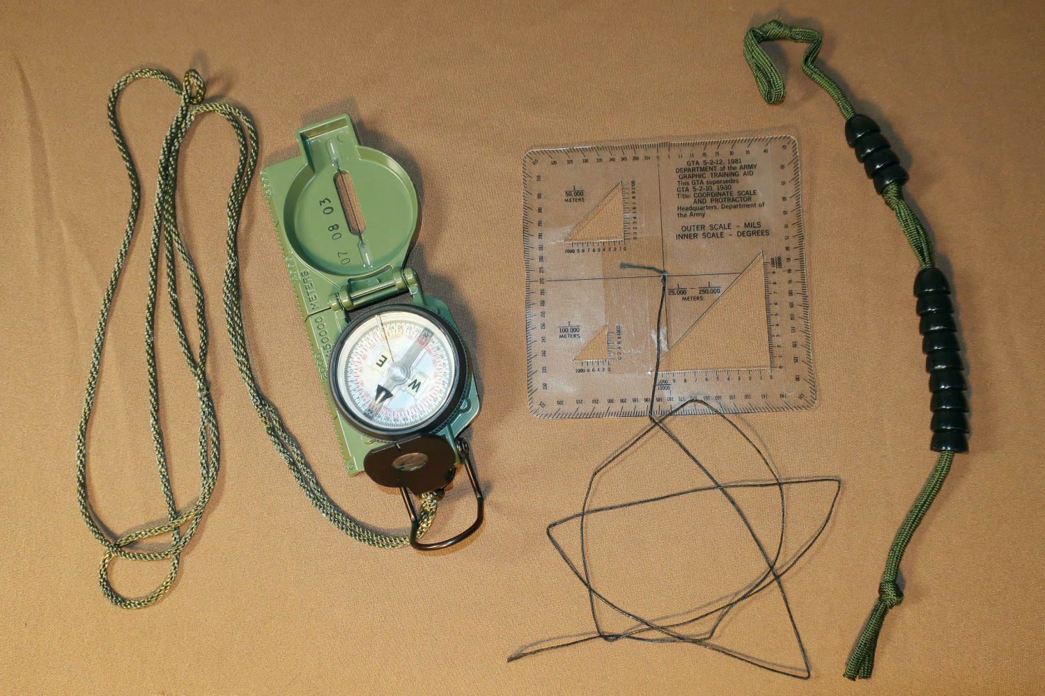(Na vysvětlenou - na zobrazeném hodně opotřebeném protractoru byla z prostorových důvodů odstřihnuta úhlová stupnice v MILech, která je potřebná víc pro dělostřelce, než běžného pěšáka, kterého zajímají jen stupně a dále je na něm osazen provázek pro odečítání úhlů. Kompas asi poznáte; tento je podsvícený tritiem, takže jej není třeba pro noční používání nasvěcovat. A ta třetí věc - to je korálkový krokoměr. Popisem jeho používání zde zdržovat nebudu.)