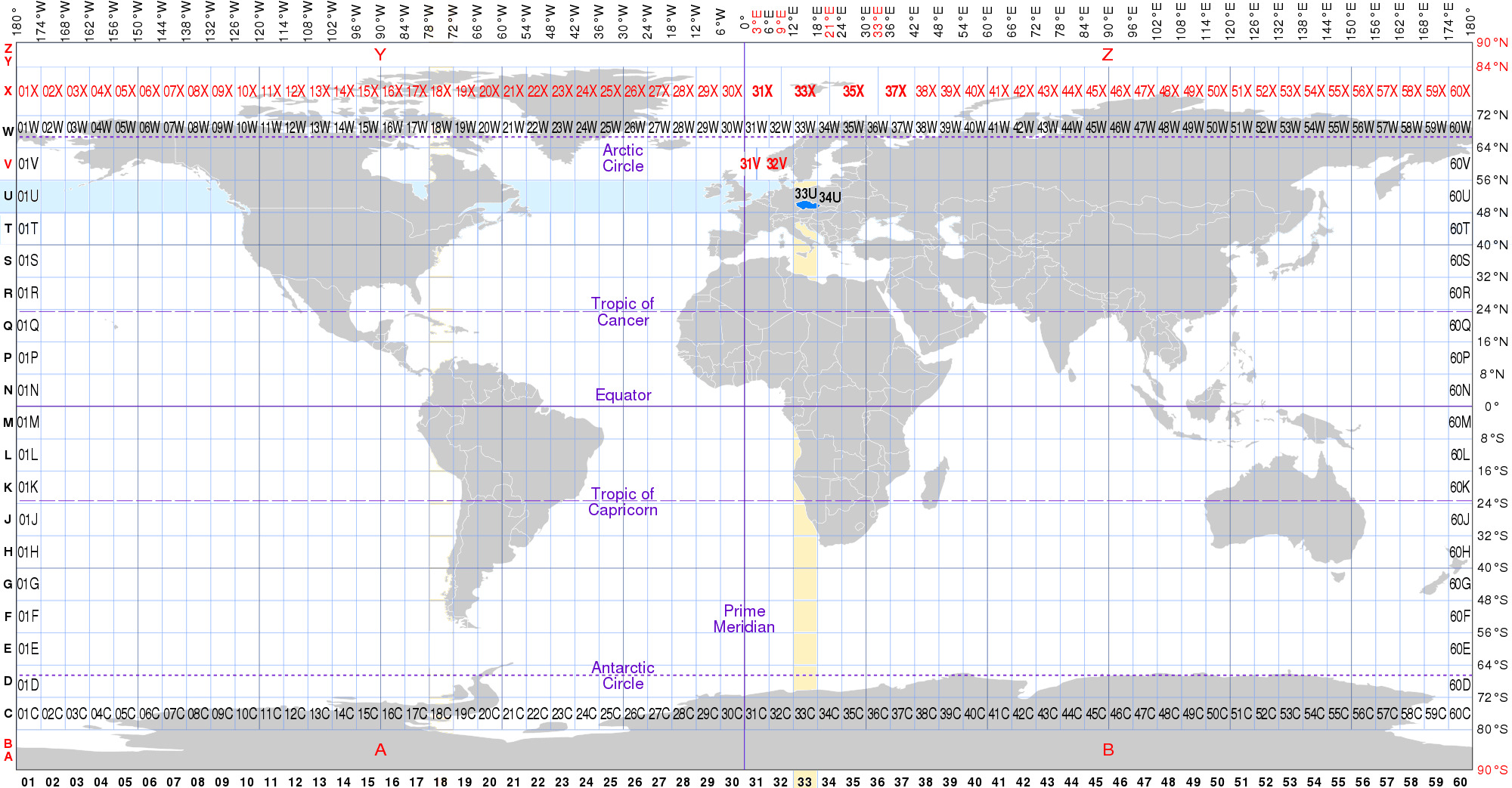 Jak je zvýrazněno, Česká republika patří téměř celá do zóny 33U a drobná východní část pak do zóny 34U: