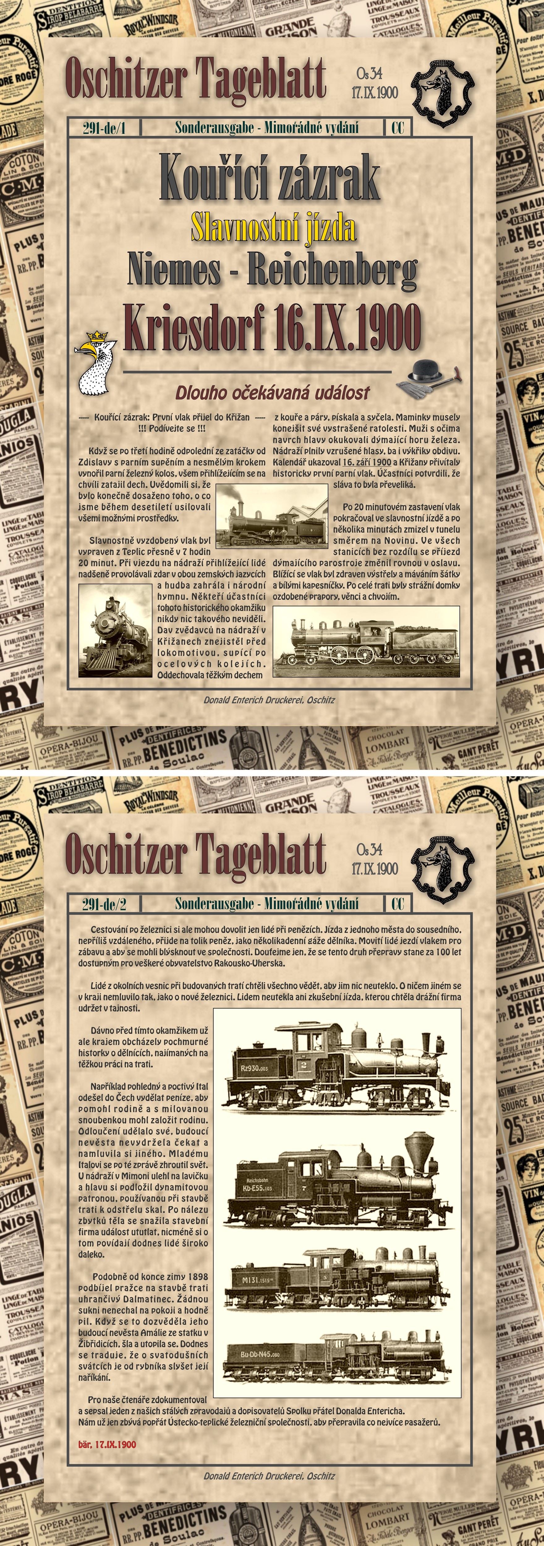 První slavnostně vyzdobený vlak na této unikátní trati vyjel dne 16. září 1900. Než dorazil z Mimoně do Liberce, překonal dva viadukty, pět tunelů a projel mnoha nádražími s charakteristickými budovami s cihlovou fasádou. O první jízdě slavnostního vlaku Ústecko-teplické společnosti se můžete dočíst v dobovém tisku: