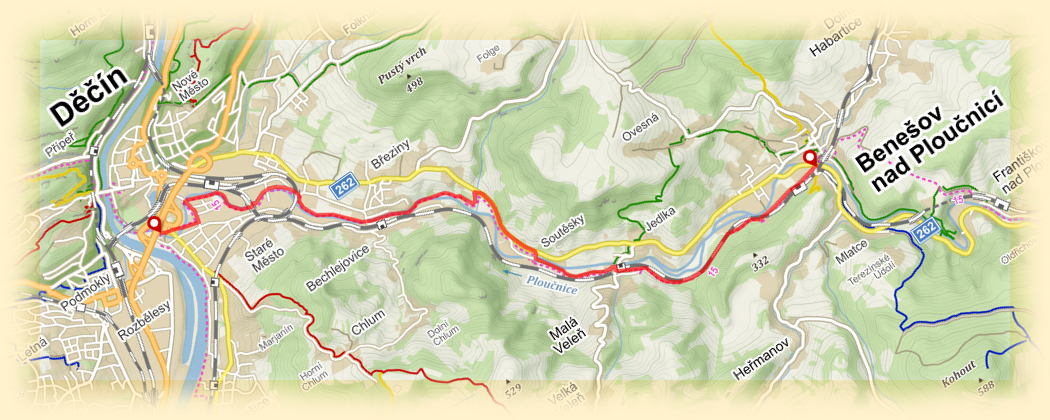Cyklotrasa č. 15 mezi Děčínem a Benešovem nad Ploučnicí vyznačená v mapě