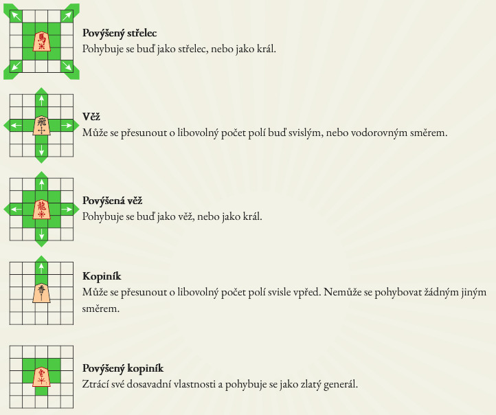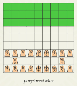 Pro každého z hráčů představují poslední tři řady na protilehlé straně hrací desky tzv. povyšovací zónu. Pokud hrací kámen svůj tah zahájí nebo ukončí v povyšovací zóně, může být na konci tahu povýšen obrácením na červený znak, tzn. včetně situace, kdy z povyšovací zóny vycouvá. U většiny hracích kamenů se může hráč rozhodnout, zda je v daném tahu chce povýšit nebo ne. Výjimku tvoří kameny, které by se bez povýšení již nemohly dále pohybovat, tzn. jejich příští tah by směřoval pouze mimo hrací desku. Proto musejí být pěšci a kopiníci povýšeni pokaždé, když se ocitnou v poslední řadě hrací desky, a jezdci jsou vždy povyšováni na posledních dvou řadách.