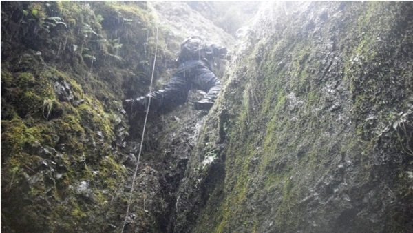 “Thank you Colorado for placing a cache here. I am exhausted and will never forget this adventure, definitely one of my all time favorites.” That’s the latest log entry for “Wahe Ka-Ho-Nee” (GCJZDX). It’s an extreme geocache rated a difficulty 2 and terrain 5. The cache owner, Colorado Jones, insists you not try this cache alone and suggests that you tell someone where you’re going and when you’ll return home. It’s easy to see why he’s so insistent. Finding the cache requires a rope, hiking poles, shoe spikes and safety supplies. Cachers wade through water and encounter poisonous plants, loose rocks and dangerous heights.