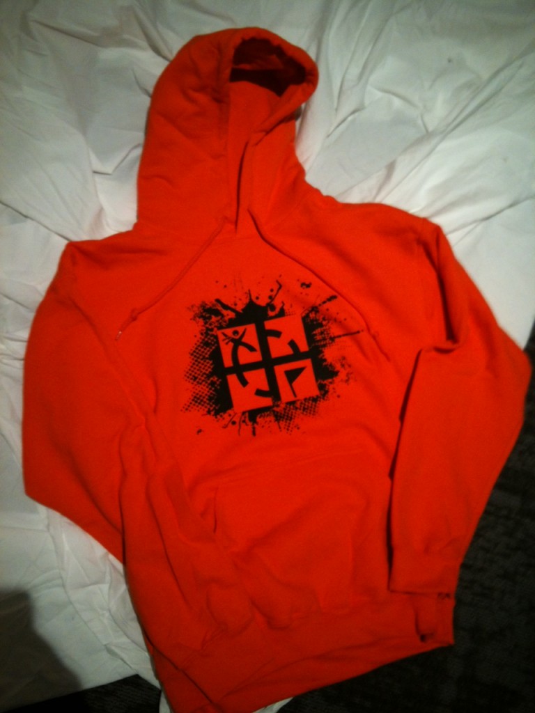 The winner receives the ‘barely coveted prize’ you see to the left, which may actually be quite coveted. It’s is a sample product submitted to Shop Geocaching – a size medium orange hooded sweatshirt. No other sizes are available to the winner.
