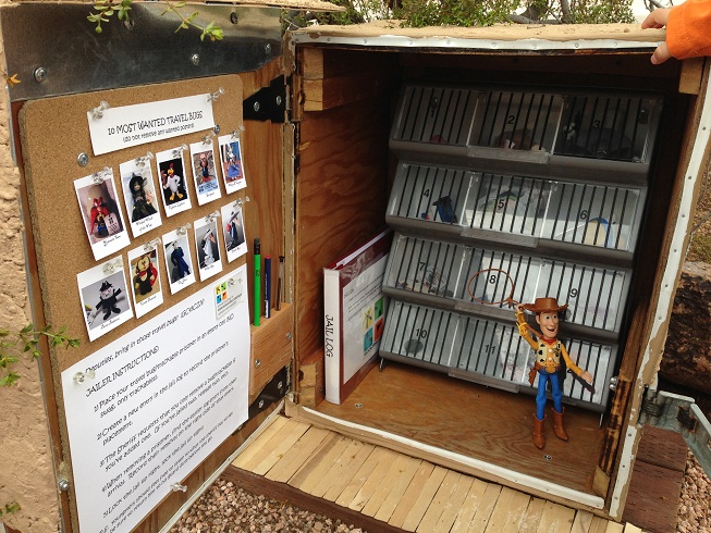 Many PodCacher shows include a mention of super cool geocaches. You might hear about several unique or unusual geocaches in one show. One of the greatest resources we have is our diverse, experienced and creative (not to mention good-looking) listener community, and it is amazing what they share with us. On Show 409, for example, a Halloween prop from the dollar store was easily turned into a fun hide called, Lend Me a Hand. Another cacher created a miniature adobe brick-style jail for travel bugs including jail cells and “most wanted” posters for the cache Deputies, bring in those travel bugs.