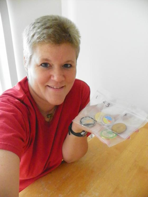 She says her story began in November of 2012. “My home was burglarized and I lost a great many items, including a three-ring binder with baseball-card pockets where I kept my geocoin collection, and a bag of geopins along with more standard stuff like laptops and other electronics.”