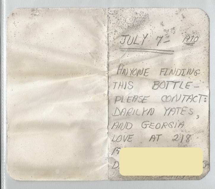 “Anyone finding this bottle please contact: Darilyn Yates and Georgia Love… ”