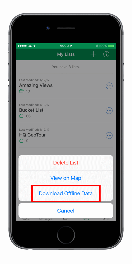 Listen, die Du auf Geocaching.com erstellst, können automatisch in der Geocaching®-App aufgerufen und bearbeitet werden – und umgekehrt. Wenn Du Listen in der App für Offline-Verwendung herunter lädst, sind die Offline-Karten mit dabei.