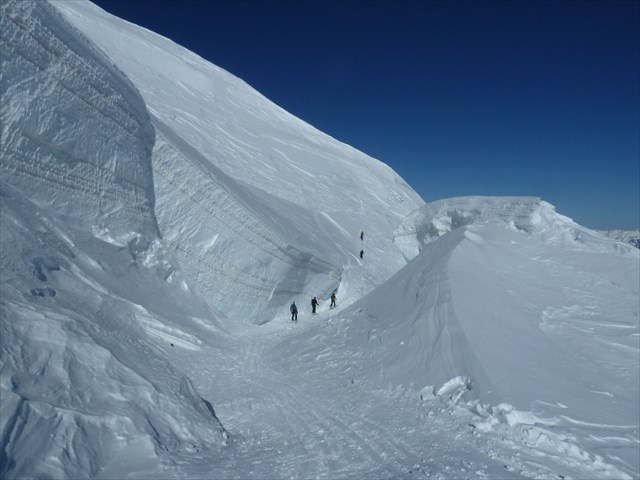 On our last day, traverse back across the Bellavista Terraces to the pass at the west end of the three summits of Piz Palü. The first summit is mostly rock. the second and third are snow, with some steep and narrow snow ridges to add spice to the adventure. After descending the large Vedret Pers glacier, climb back to the Diavolezza lift and take it back to the valley.