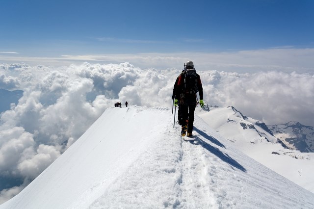 Start by riding the Diavolezza lift to almost 3,000 m. From here you descend to the Pers Glacier, cross this and ascend the Fortezza to the Bellavista Terraces. These are followed to the Marco e Rosa hut, 3,597 m, where you spend the night.
