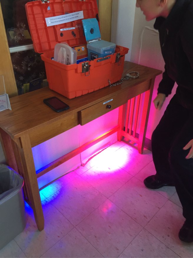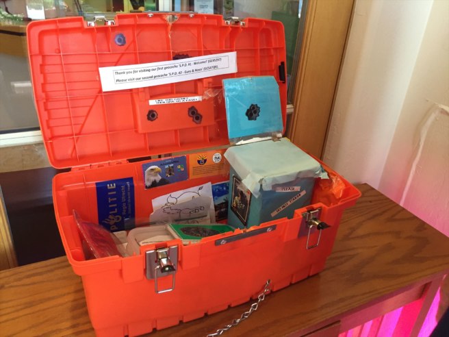 Opening the box queues the dramatic COPS theme song and police lights flash red and blue, but don’t be “alarmed” — this is supposed to happen. Inside the toolbox you’ll see the tupperware geocache container, a number of swag items, and trackables that the police station will regularly take inventory of. The cache page also reminds geocachers of an important rule of the game: no food is allowed in the cache, so donuts can be left at the front desk where the can be safely “disposed” of.