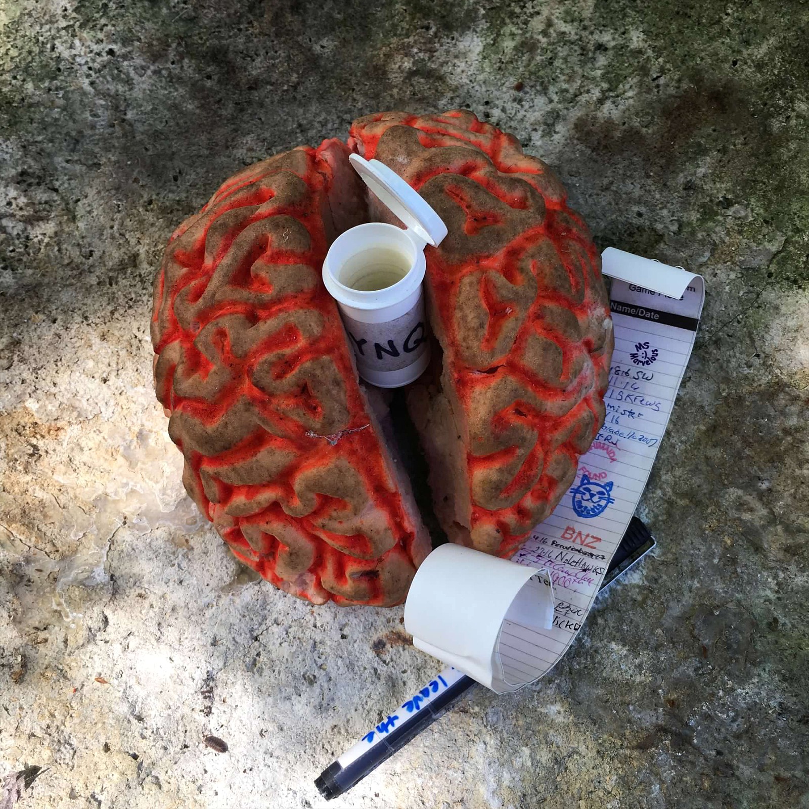 Du hast mich vor zwei Monaten unter diesem Stein neben dem Wasserfall versteckt. Es ist ein schöner Platz. Ich genieße es hier sehr. Aber jetzt, nach 25 Funden, einem Regensturm und einer Auseinandersetzung mit Moos, ist mein Logbuch voll, meine Trackables sind feucht und ich bin 15 Meter von dort entfernt wo ich sein sollte.